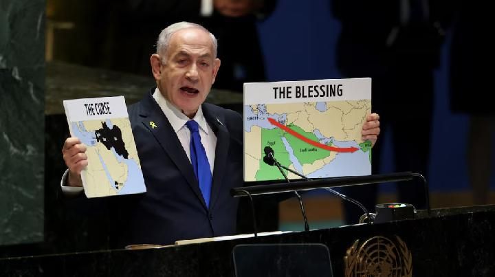 Holding up a map labeled “The Curse”, Netanyahu claimed it depicted a web of Iranian proxy groups — Hezbollah in Lebanon, the Houthis in Yemen, Hamas in Gaza, and Iran itself. By presenting this imagery at the UN, Netanyahu attempted to frame Israel not just as a nation under attack but as a frontline defender in a broader regional war against Iranian influence.